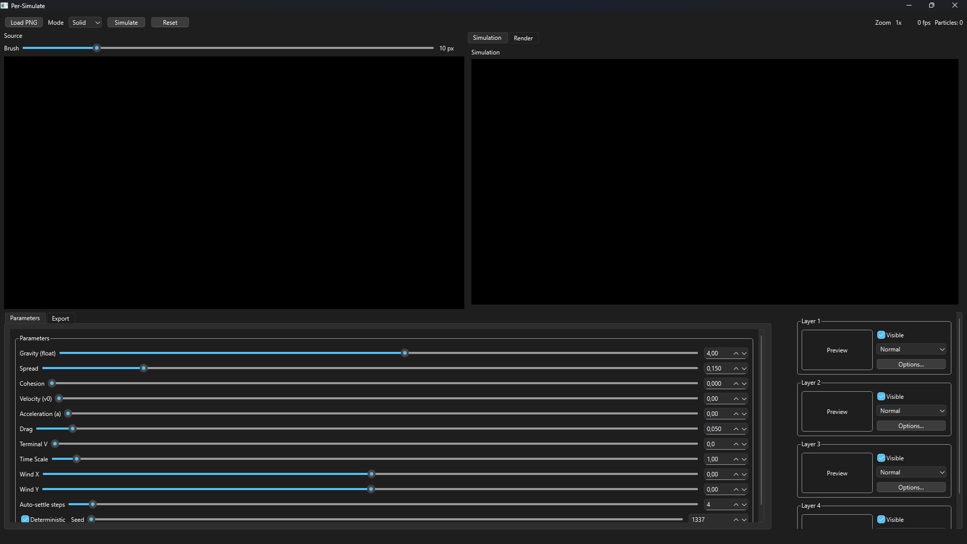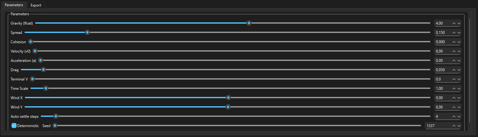 Multiple material types with customizable physical properties (density, cohesion, stickiness, turbulence, drag, etc.)